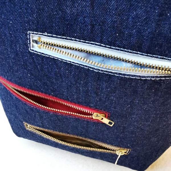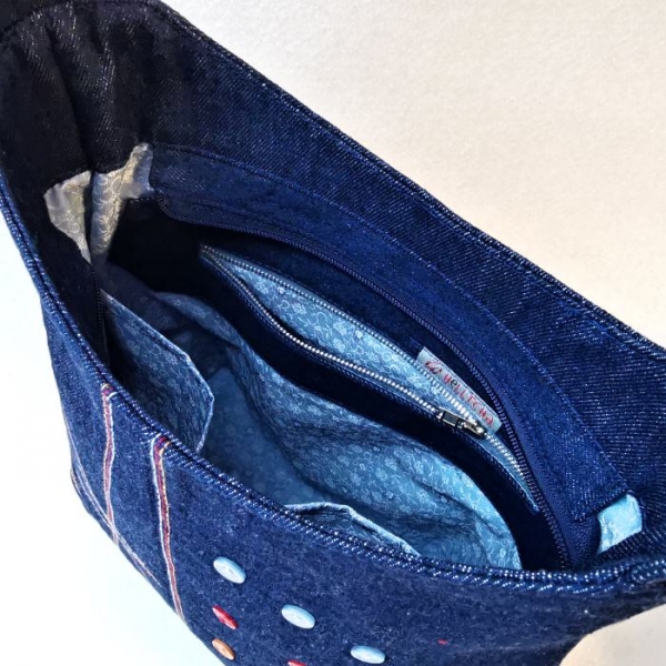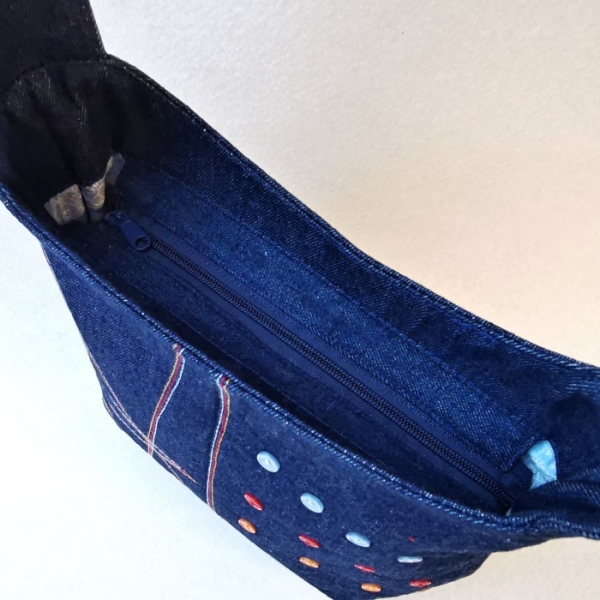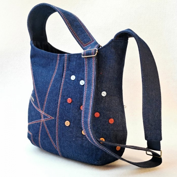 Originální ručně šitá tmavě modrá riflová kabelka je ozdobena štepováním ve třech barvách. V pravé části jsou tři řady knoflíčků ve stejných barvách jako štepování. Na zadním dílu jsou tři zipové kapsičky, které kopírují stejné barvy. Kapesní váčky jsou ušity ve stejných barvách jako jednotlivé zipy. Kabelka se zapíná spirálovým zipem.